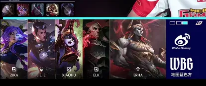 WBG选用:Zika亚恒、Jiejie赵信、Xioahu乌鸦、Elk芸阿娜、Erha露露